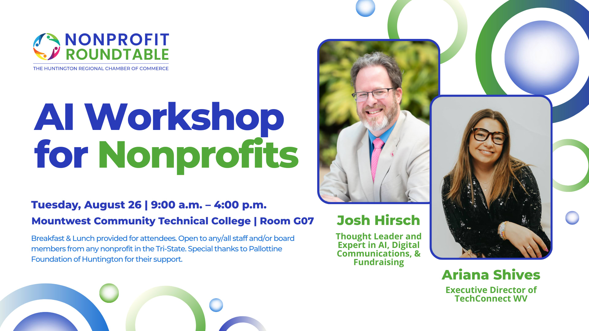 For our last Nonprofit Roundtable Speaker Series event of 2025, Josh Hirsch will lead a presentation titled "Leveraging AI and Technology" during the morning session, and Ariana Shives, Executive Director at Tech Connect WV, will lead the afternoon session. A free lunch will be provided to those who register. This event is exclusive to all nonprofits and their employees in Cabell and Wayne counties. Date: Tuesday, August 26 Time: 8:30 a.m. to 4 p.m. Location: Mountwest Community & Technical College, G07 Learn more: https://www.huntingtonchamber.org/non-profit-roundtable-council/